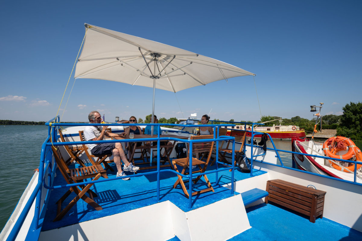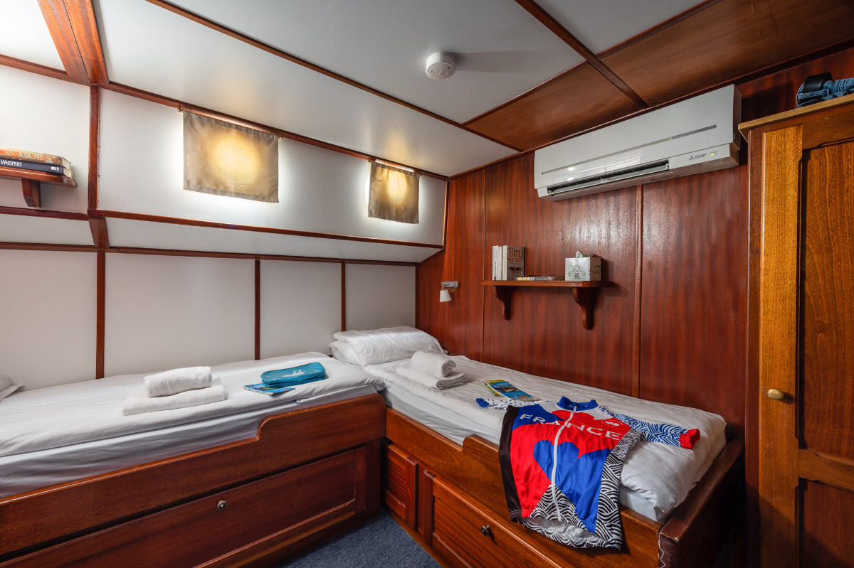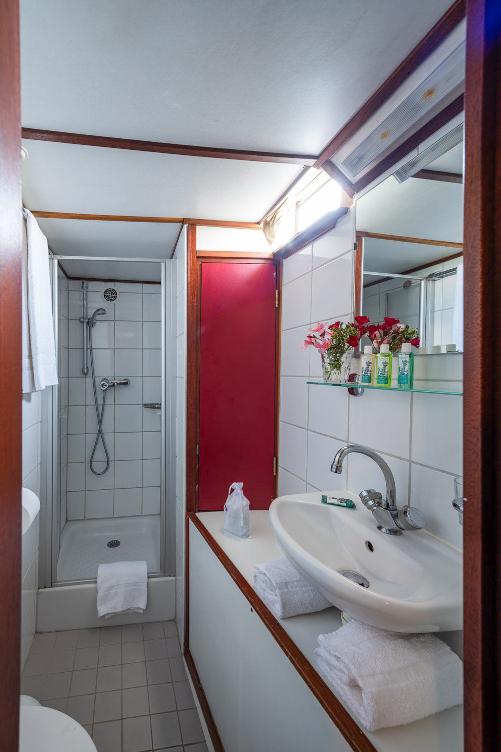 All with air conditioning and private bathrooms, hairdryer, safety box and courtesy kit. Each cabin has two fixed portholes. Bed measurements: 1.90m x .80m (singles) and 1.90m x 1.40m (doubles). The “staterooms” are well equipped with colorful furnishings and an opening porthole, creating a charming and cozy atmosphere. There is also a wardrobe and adequate space for storing your luggage. Free WiFi available in the restaurant/bar area. There is a sundeck with seating accommodation and fixed awning.