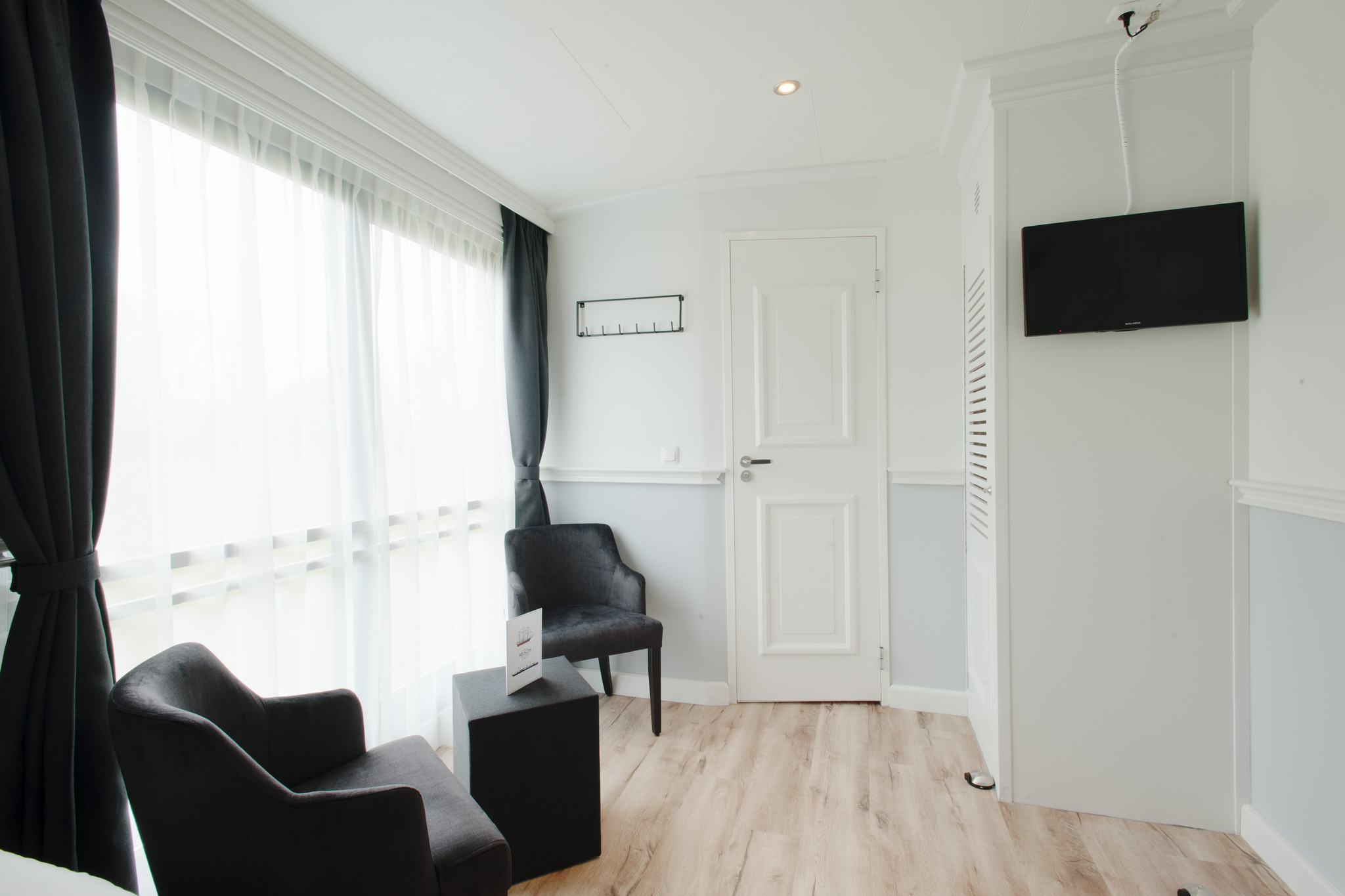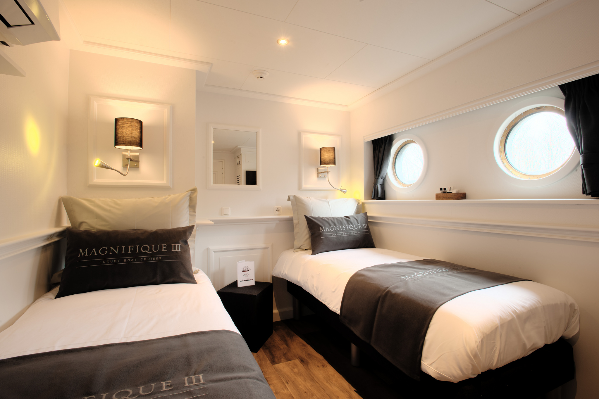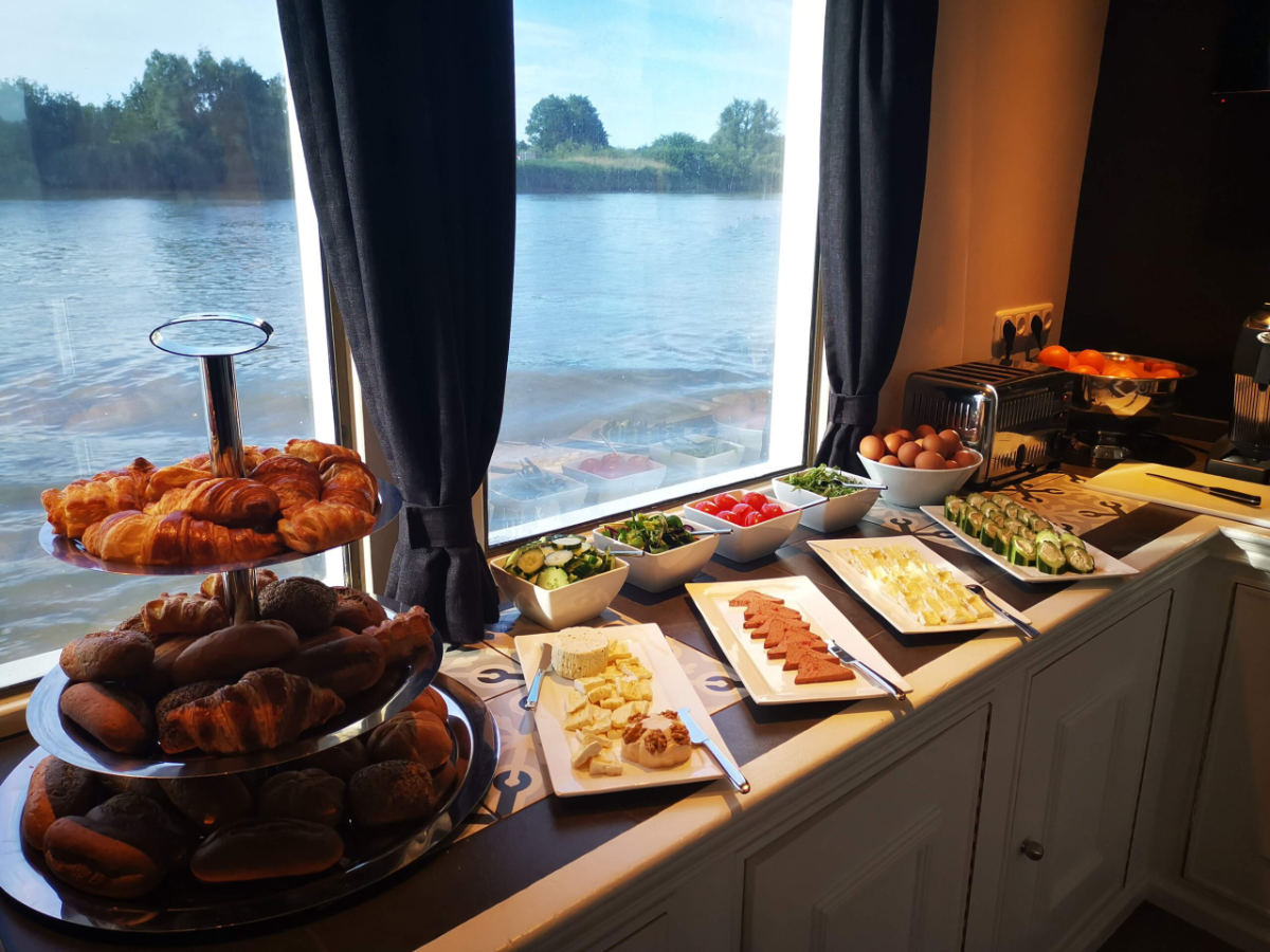 The premium ship Magnifique III has been launched in 2018. The upper deck has a large, tastefully furnished salon with a restaurant area, a nice bar and a lounge area with cozy sitting corners, a wide screen TV and large panoramic windows. There are also two TV screens (a camera and a navigation system) to see the real-time movement and position of the barge. Large glass doors open to the beautiful partially roofed teak wood sundeck with chairs and tables on the aft deck. There is a cycle deck on the front deck. On the top deck, the barge has a whirlpool/Jacuzzi and some deckchairs to relax and enjoy the scenery while cruising.
