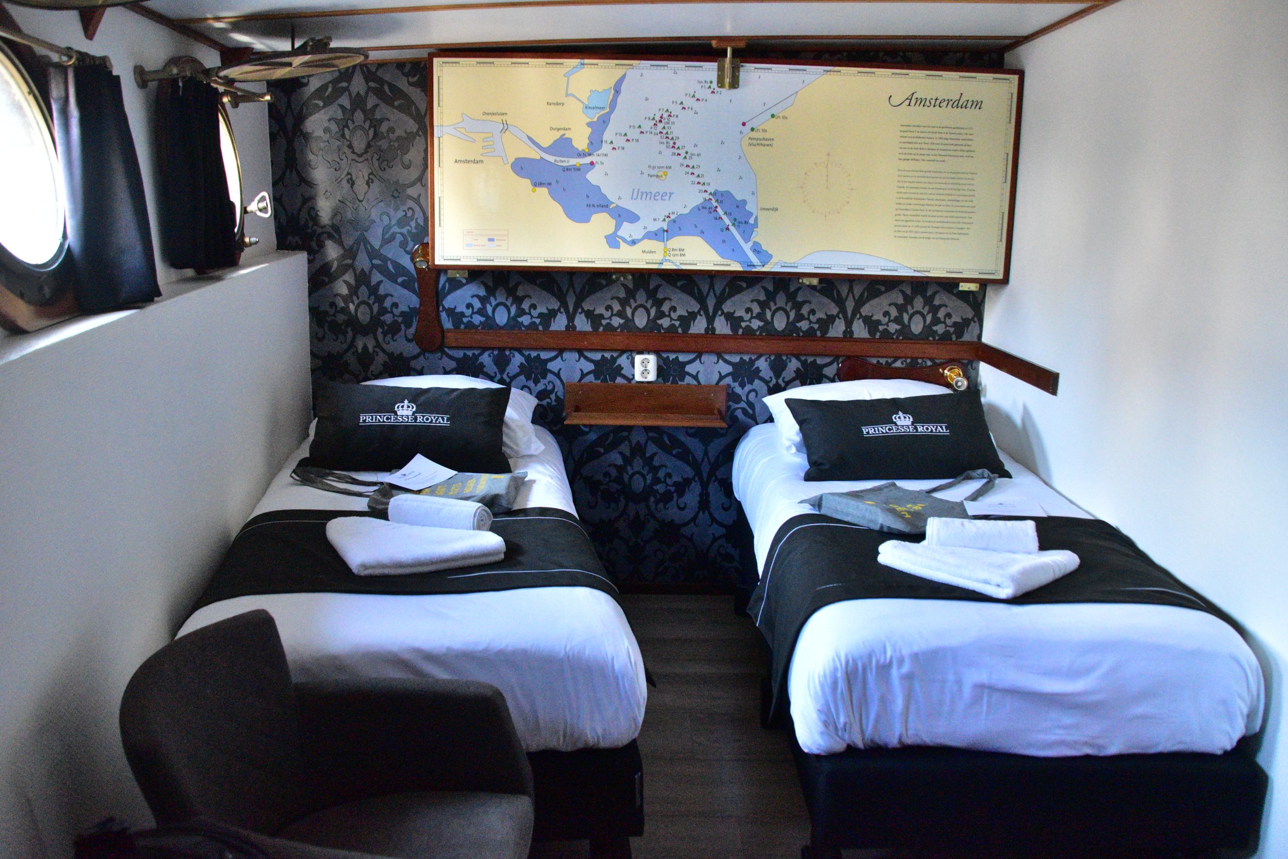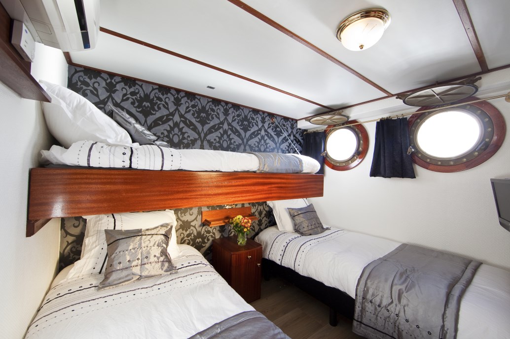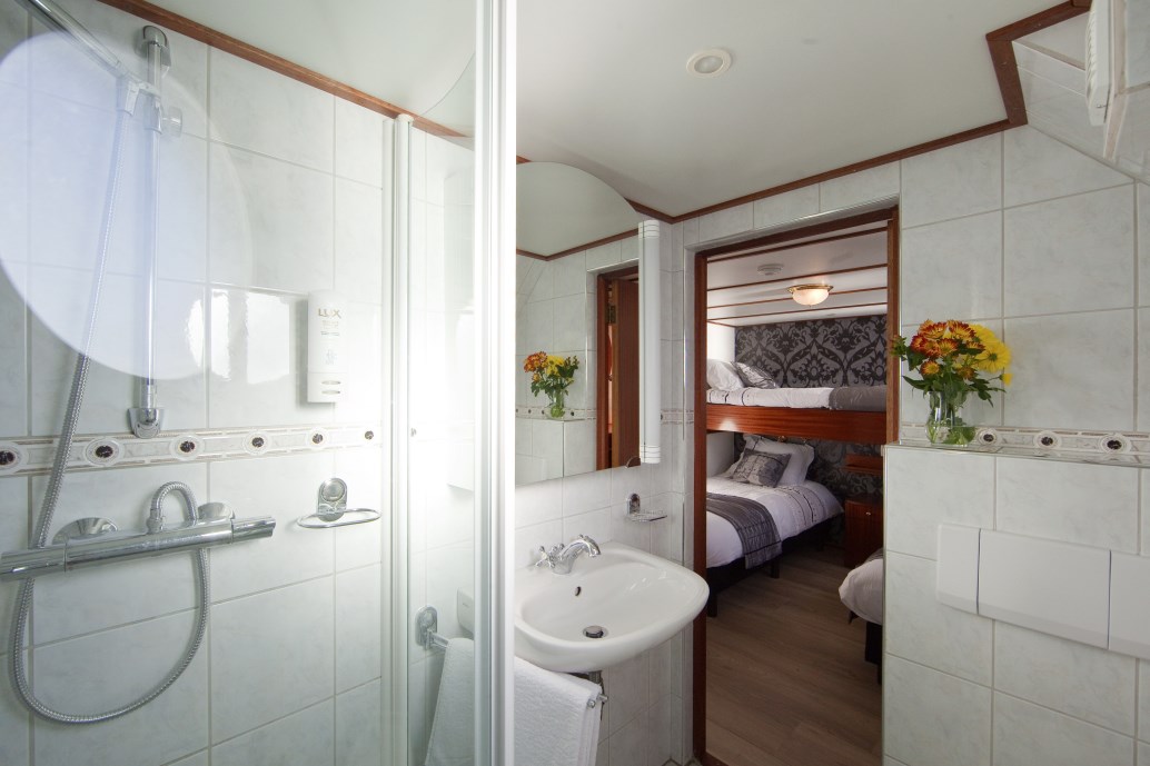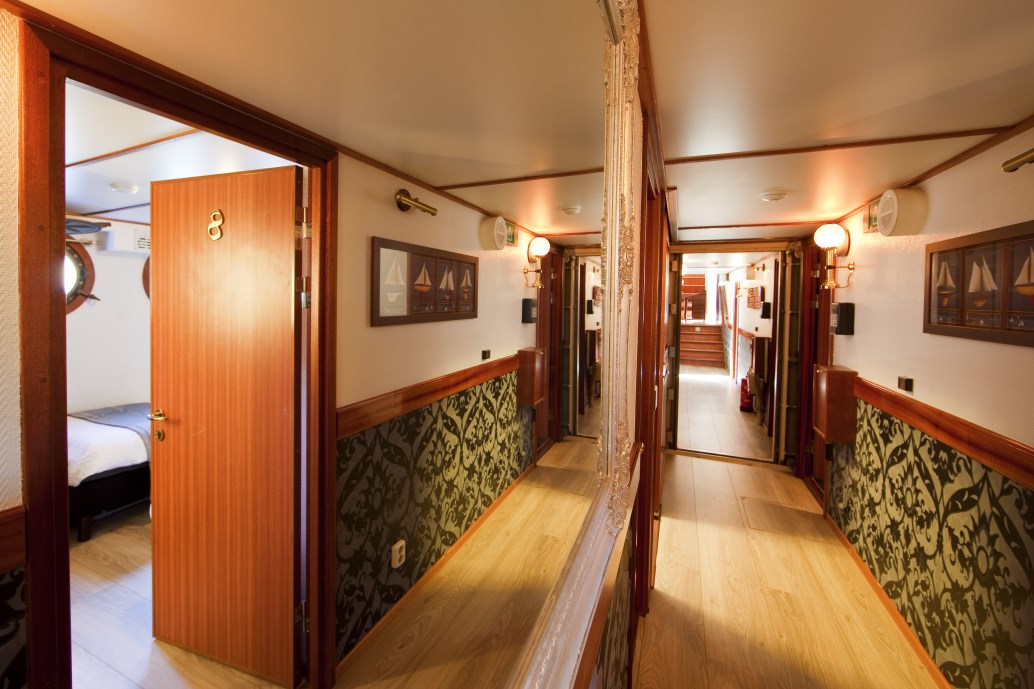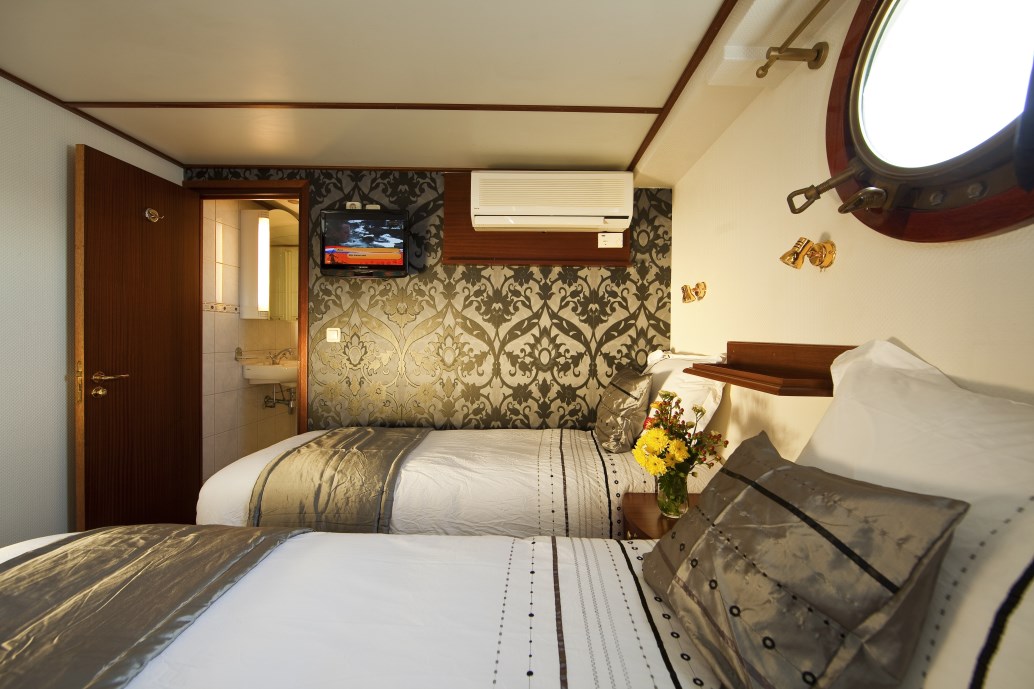 The hull of the Princesse Royal was originally constructed as a seagoing sailing vessel: this explains the unique shape of the ship. But the vessel was then converted to become a passenger barge for inland waterways. The owner and skipper of this fine barge, sets high standards to atmosphere, personal service and comfort, with the aim to offer his guests an unforgettable stay on board, in line with the “premium” classification. The Princesse Royal has fifteen twin cabins and one single. On prior request, the beds in most twin cabins can be set together as a double bed. Each cabin has an en-suite bathroom with shower, toilet and wash basin. All cabins have an individually regulated air conditioning, ventilation system and central heating; the portholes in all cabins are fixed for safety reasons. Furthermore, each cabin has a flat screen (satellite) TV, a mini safe and a hair dryer.