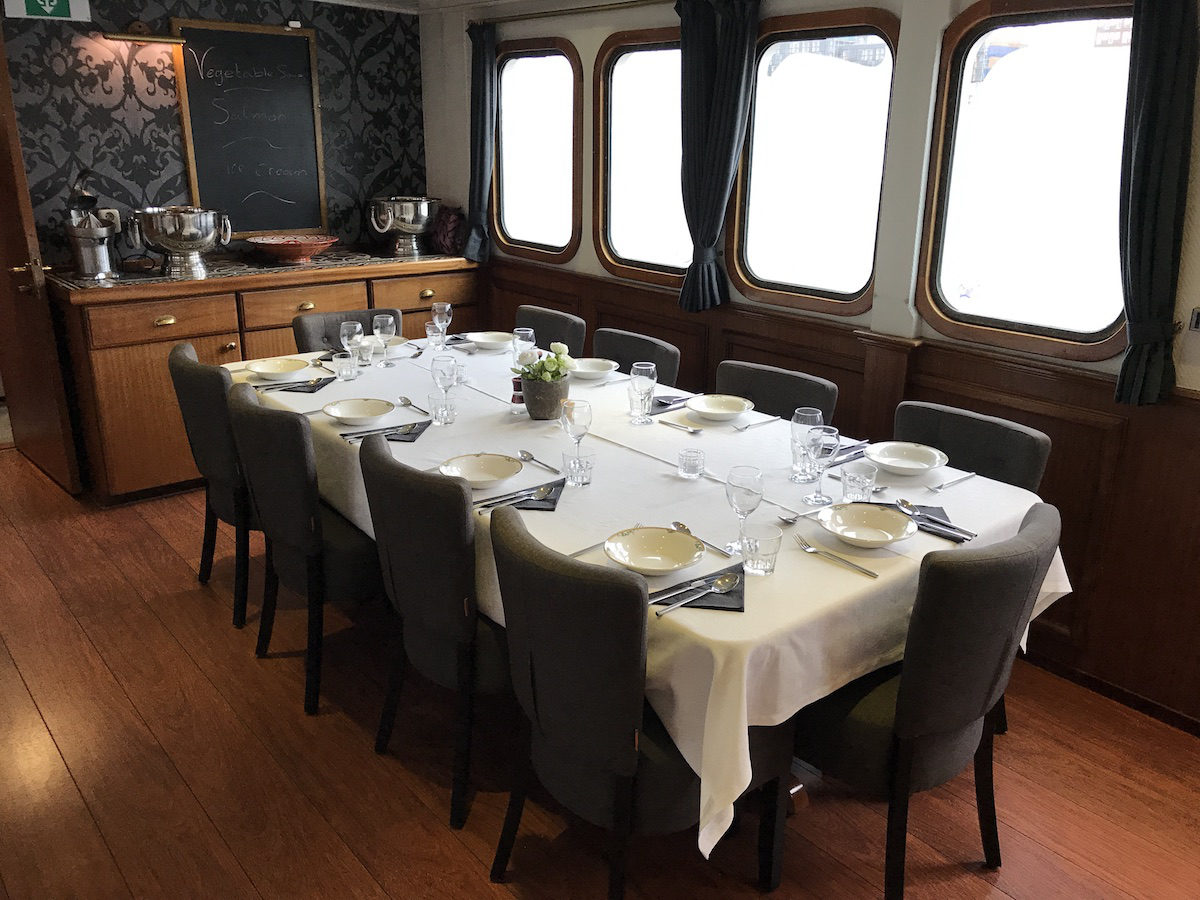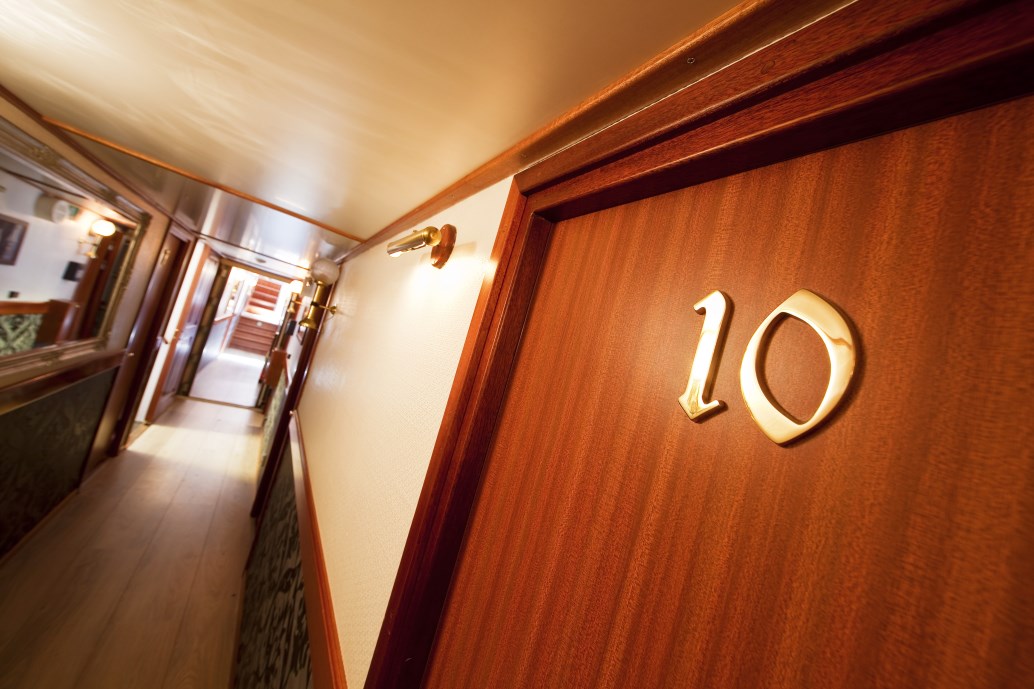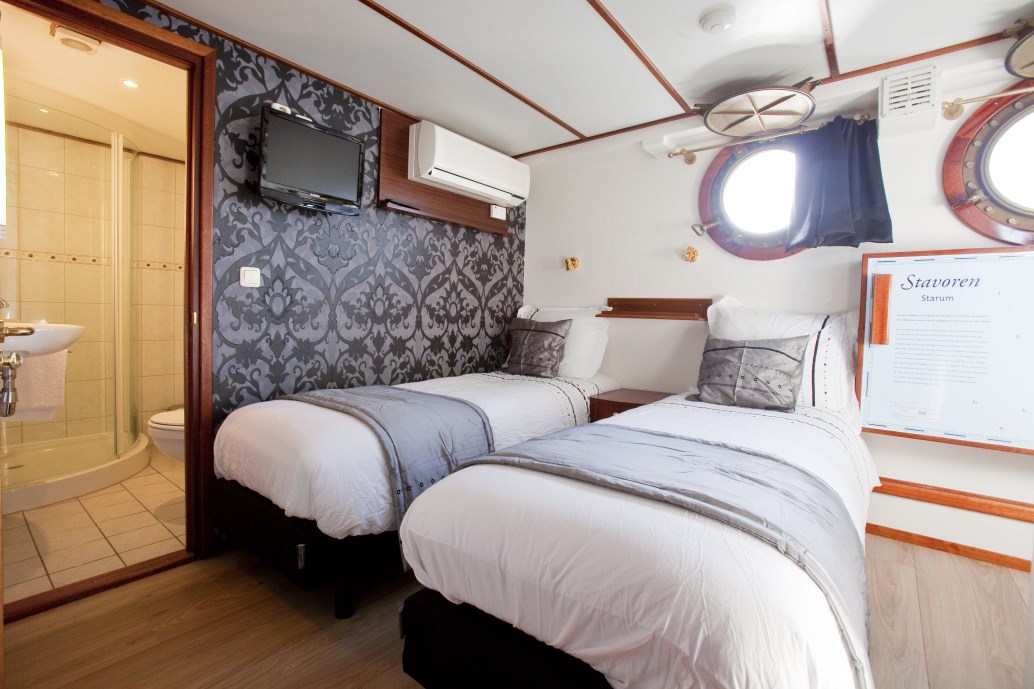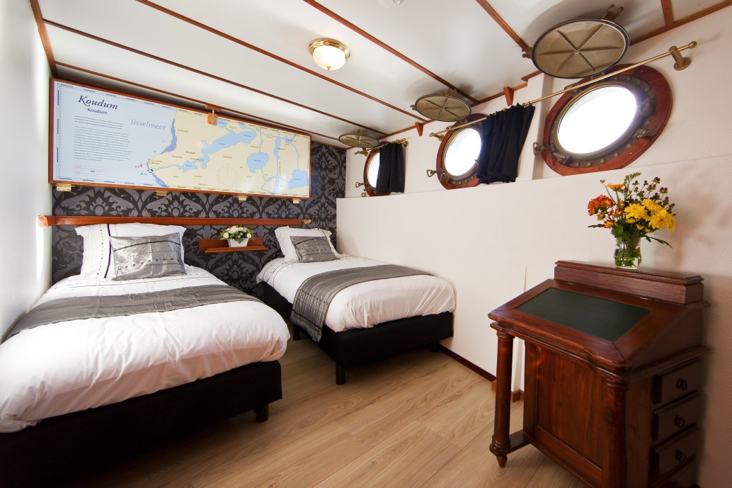 The hull of the Princesse Royal was originally constructed as a seagoing sailing vessel: this explains the unique shape of the ship. But the vessel was then converted to become a passenger barge for inland waterways. The owner and skipper of this fine barge, sets high standards to atmosphere, personal service and comfort, with the aim to offer his guests an unforgettable stay on board, in line with the “premium” classification. The Princesse Royal has fifteen twin cabins and one single. On prior request, the beds in most twin cabins can be set together as a double bed. Each cabin has an en-suite bathroom with shower, toilet and wash basin. All cabins have an individually regulated air conditioning, ventilation system and central heating; the portholes in all cabins are fixed for safety reasons. Furthermore, each cabin has a flat screen (satellite) TV, a mini safe and a hair dryer.