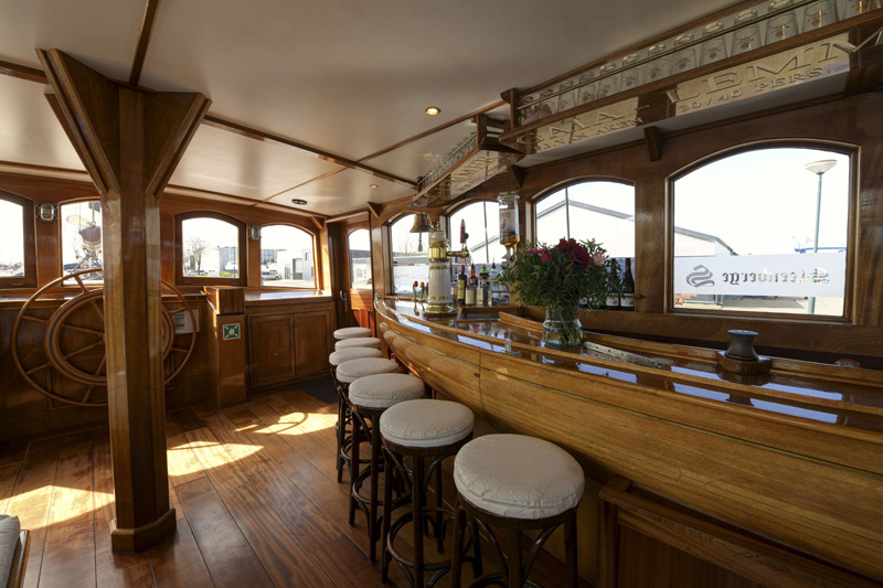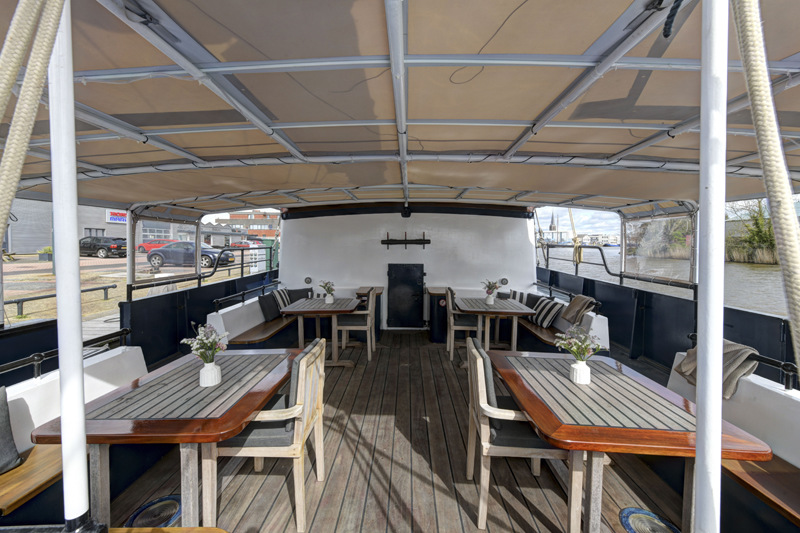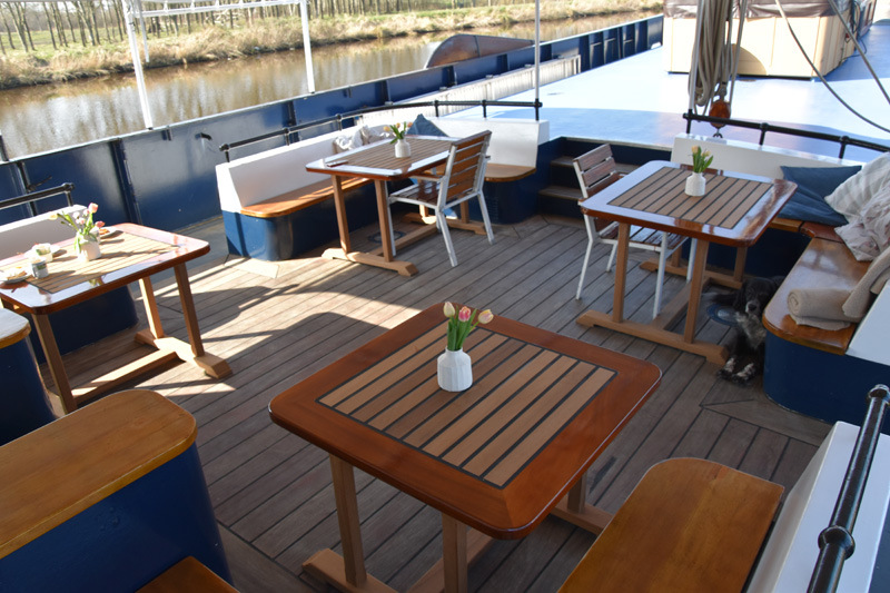 On the lower deck the Wapen van Fryslân offers a large lounge/restaurant with TV, which is characterized by its luxurious appearance and flexible furnishing. From here you can reach the large wheelhouse with a cosy and stylish bar and seating area. The panoramic windows offer a perfect all around view of the water. Wi-Fi is available. The afterdeck has an outdoor cafe with draught beer tap and a Jacuzzi and on the middle deck there are various sitting areas and there is room to enjoy a lovely meal outdoors to watch the scenery while sailing.