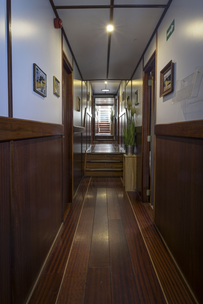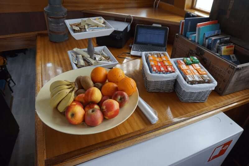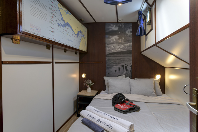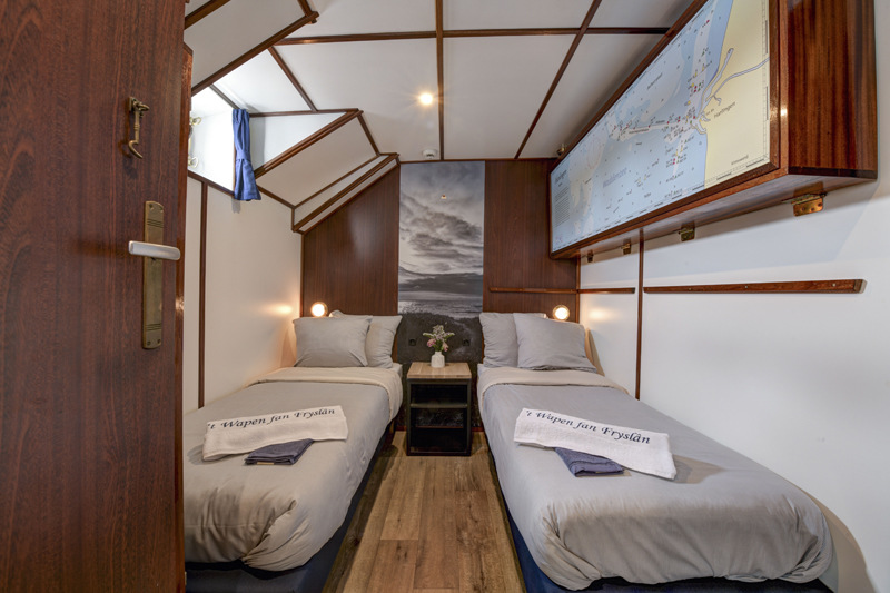 The twelve identical twin cabins (8,5 m² – 91 sq.ft.), each with two separate single beds which can be set together and a folding bed as a third bed which can be used if needed. In each cabin there is a bathroom with shower, toilet and basin. All cabins have ventilation, central heating and two portholes of which one can be opened. Furthermore, you will find a mini safe in each cabin.
