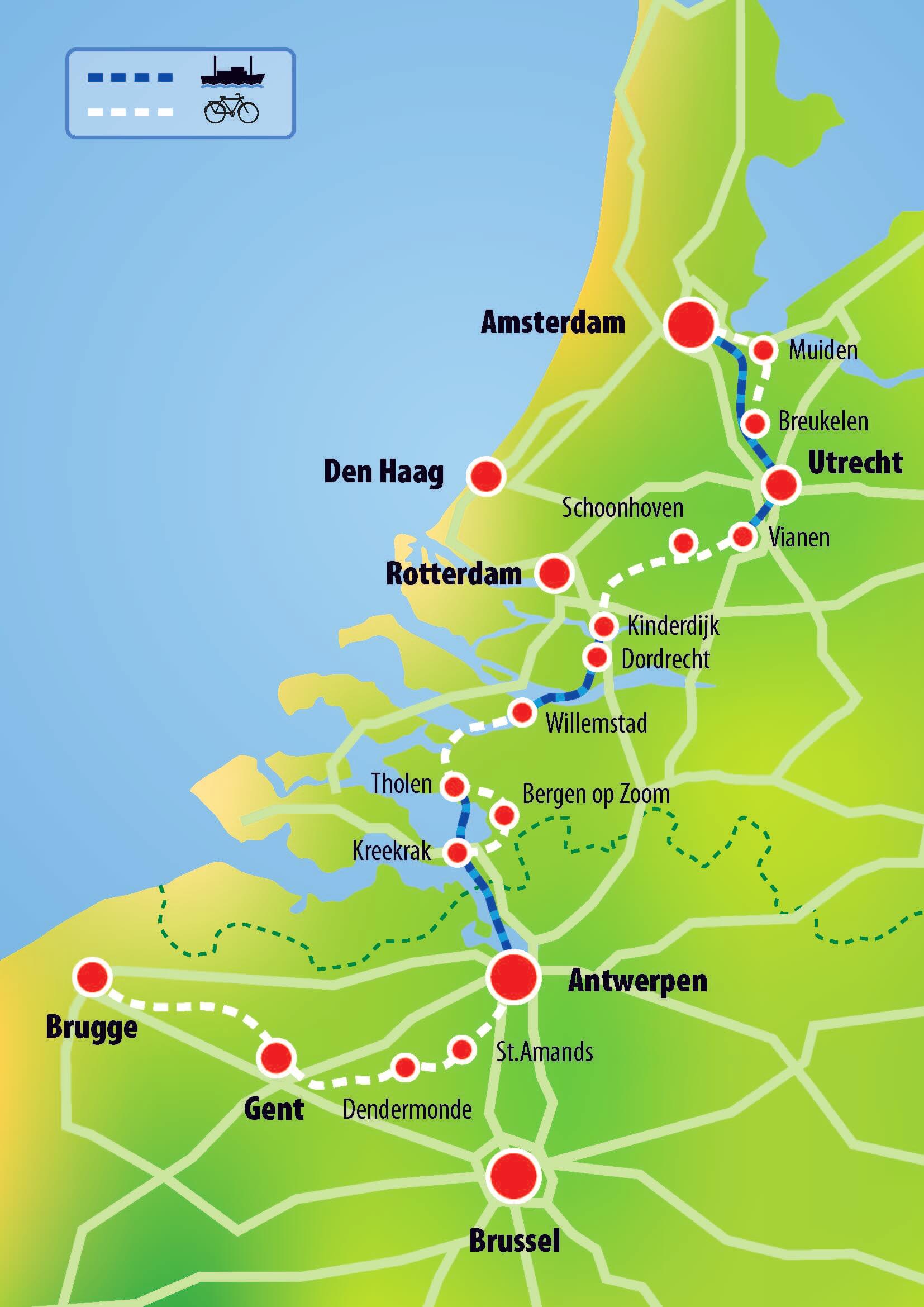 During the day you will cycle to world famous destinations such as Amsterdam, Kinderdijk, Dordrecht, Antwerp, Ghent and Bruges, while at night you will relax in the comfort of your Luxury floating hotel.