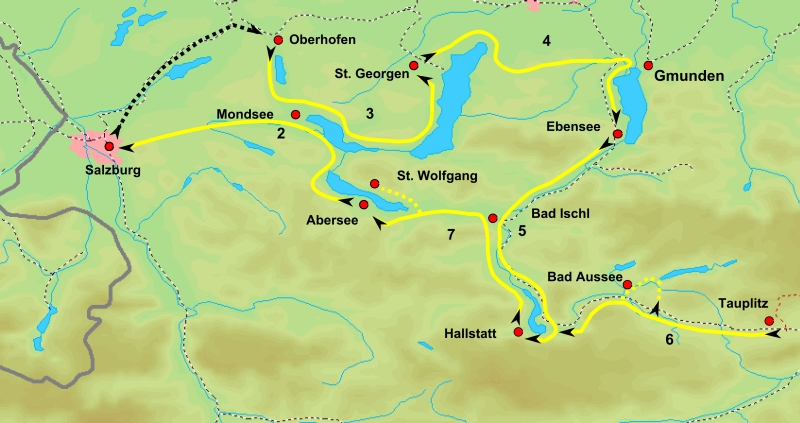 With the ferry you will cross the lake and follow the lovely cycle trail along lake Hallstatt. Afterwards you will follow the river Traun to the Emperor city of Bad Ischl where you should visit the emperor villa and the famous pastry shop of Zauner. Along the former roman road you will cycle to the lake Wolfgangsee. Overnight in Abersee, Strobl or St. Wolfgang.
