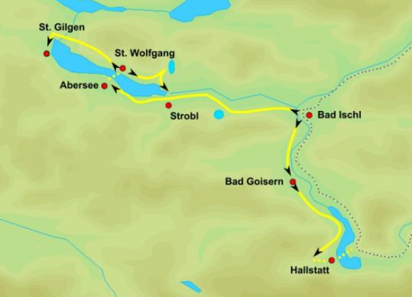 You’ll start with another boat ride to St. Wolfgang. First you’ll walk up to shimmering Lake Schwarzensee, where you can rest in a nice mountain hut with a terrific view over the surroundings and enjoy some tasty local specialties. You will walk down on a small footpath into the valley next to a gorge and around the Bürglstein, a rock outcrop jutting into the lake. In the afternoon you’ll end in Strobl and transfer to the “Emperor’s Town,” Bad Ischl.