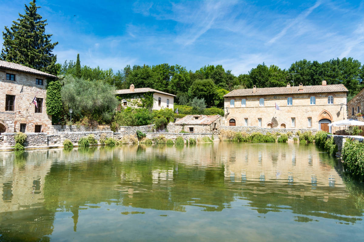 We’ll leave Pienza today on a dirt road toward the village of San Quirico d’Orcia. This fortified village is one of the least known and best-preserved historical centers in the Sienese Province. It was an important stop for pilgrims on the Via Cassia, the way to Rome. The 15th century walls are still almost totally intact. They enclose the magnificent 13th century Romanesque Collegiate Church with a famous stained glass window and hand carved wooden choir-stalls. The main street of San Quirico, Via Dante Alighieri, traverses the town and contains a number of well-preserved medieval houses. Most notable is the Renaissance Palazzo Pretorio. There is plenty to see and photograph in this quaint village, including the Horti Leonini, an unusual public park with a Renaissance style garden created by Diomede Leoni in 1580. From San Quirico, a small road leads up through beautiful countryside to the tiny village of Alto Vignoni, now almost totally abandoned. It has a truncated medieval tower and a Romanesque church on the edge of the hill. You’ll definitely want to take a short stop to admire the spectacular view! From Vignoni, we’ll wind our way down to other points of interest in the beautiful Orcia Valley: the stony river bed, the castle of Ripa d’Orcia, and the ancient spa of Bagno Vignoni. Here you can soak your feet in the warm sulphurous waters that bubble up into a large pool constructed by the Medici family in the Piazza. Tonight you’ll stay in Bagno Vignoni or in an agriturismo 2 km from town along your trail.